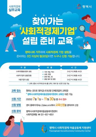 평택시(시장 정장선)는 7월 1일부터 11월 30일까지 ‘찾아가는 사회적경제기업 설립준비 교육’신청을 받는다고 밝혔다.
