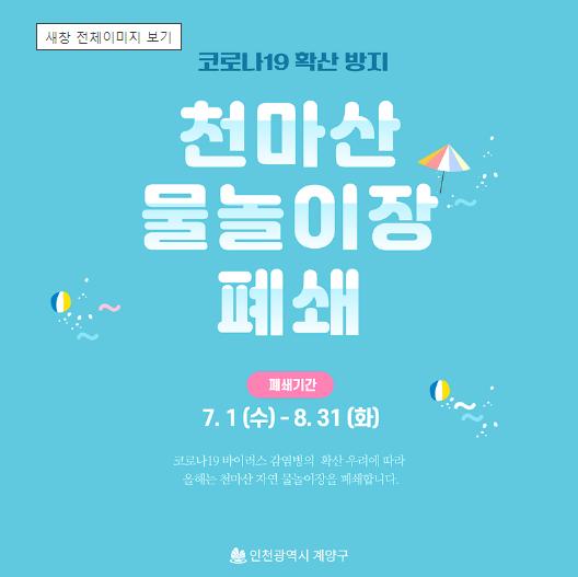인천 계양구(구청장 박형우)는 코로나19 지역사회로의 확산 방지 및 중앙재난안전대책본부의 『수도권 집단 발생 대응 방안』에 따라 천마산 자연 물놀이장 운영을 올해에는 전면 중지하기로 결정했다.