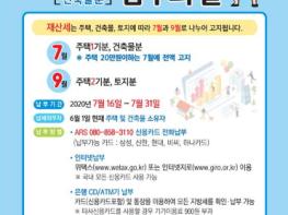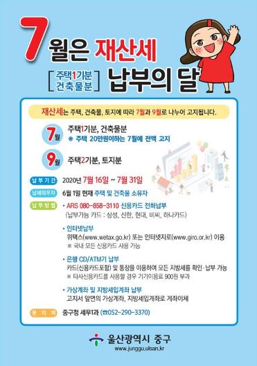 재산세는 매년 6월 1일 현재 주택·건축물·토지 소유자에게 부과되는 세금으로, 7월은 주택분 2분의 1에 해당하는 금액과 건축물분이 부과되고, 9월은 주택분 2분의 1에 해당하는 금액과 토지분 재산세가 부과된다.