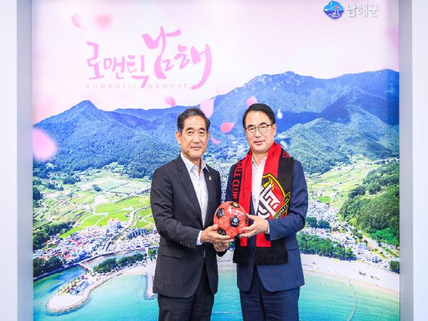 이 자리에서 박진관 대표이사는 천연잔디구장 등 남해군의 훌륭한 축구 인프라를 높이 평가하고 “남해군의 우수한 유소년 축구선수들이 다른 지역으로 유출되지 않도록 유소년 축구선수 육성을 위해 노력하겠다”며 함께 협력해 나가자고 말했다. 또 프로축구 유관중 경기가 시작되면 남해군민들을 초청해 이벤트 행사를 진행하자고 제안했다.