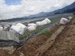 물이 빠지면서 드러난 하우스 시설은 호우에 떠내려온 곤포 사일리지로 인해 처참한 상황이었다. 볏짚 등을 비닐로 밀봉한 곤포사일리지는 하우스 철재 위쪽은 물론 하우스 사이사이에서 파이프를 누르고 있었다. 이로 인해 하우스 개폐가 불가능하고 악취가 발생하는 등 복구작업이 지연돼 큰 어려움을 겪고 있다.