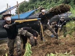 m 장병들은 코로나19 확산을 막기 위해 작업중에도 마스크 착용 등 개인 방역에 유의한 가운데 농가 토사ㆍ농작물ㆍ제방정리, 마대 적성작업, 침수주택 정리 및 복구를 하는 등 작업에 매진했다.