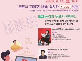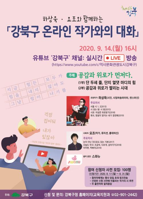 강북구(구청장 박겸수)가 ‘하상욱·요조와 함께하는 온라인 작가와의 대화’를 9월 14일(월) 16시 유튜브 ‘강북구’ 채널에서 실시간 방송한다.