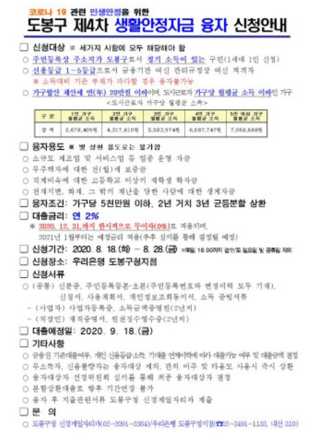 ‘제4차 생활안정자금’ 무이자 융자 지원 신청기간은 8월 18일부터 8월 28일까지이다. 우리은행 도봉구청지점에 신청하면 된다.