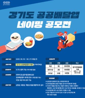 경기도주식회사가 도민의 생활 편의 증진 및 소상공인의 권익 보호를 위해 추진하는 ‘(가칭)공공배달앱 구축사업’ 서비스의 이름을 공모한다.