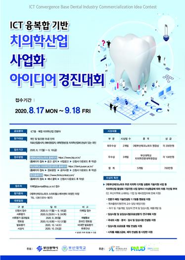 부산시(시장 권한대행 변성완)는 10월 14일 부산테크노파크에서 열리는 「2020년 ICT 융복합 기반 치의학 산업 아이디어 경진대회」에 참가할 개인 및 팀(5명 이내) 단위 참가팀(10개)을 9월 18일까지 모집한다고 밝혔다.