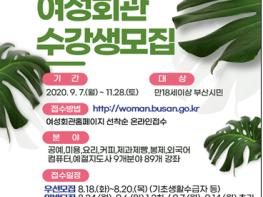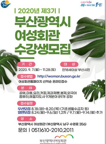 부산광역시 여성회관(관장 김혜윤)은 만 18세 이상의 부산시민(가족특강은 아동포함)을 대상으로 하는 ‘2020년 제3기 교육과정’을 9월 7일부터 11월 28일까지 운영한다고 밝혔다.