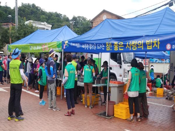 경남도자원봉사센터는 또 자원봉사자들의 중식제공을 위해 지난 12∼14일 3일간 BK 사랑의 밥차와 LH 나눔밥차 2대를 파견하여 총 1800인분을 제공했다. 밥차 운영을 위해 하동군새마을부녀회 회원 65명과 하동군여성단체협의회 회원 30명이 힘을 보탰다.