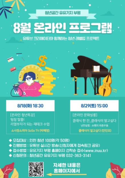 각 프로그램은 ‘유유기지 부평’ 홈페이지(www.inuu.kr)에서 선착순으로 접수 가능하며, 인천 청년이면 누구나 무료로 신청할 수 있다. 접수 일정 등 자세한 내용은 ‘유유기지 부평’ 홈페이지를 참고하거나 전화(☎363-3141)로 문의하면 된다.