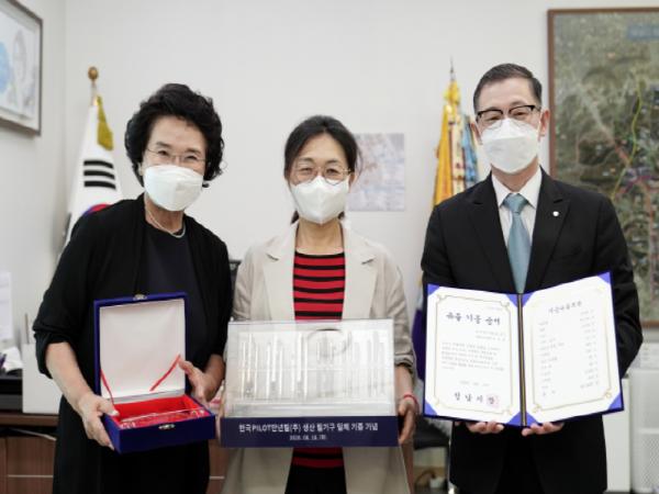성남시(시장 은수미)는 한국파이롯트(주)로부터 만년필 등 필기구 생산제품 4만여점 기증에 따른 기증증서와 감사패를 전달했다.