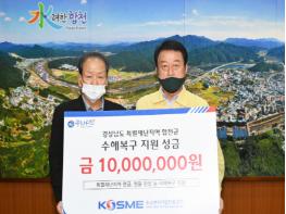 지난 18일 중소벤처기업 진흥공단(대표 김학도)은 힘든 시기를 겪고 있는 수해민에 써달라며 합천군(군수 문준희)에 긴급수해복구 성금 1천만원을 기탁했다.