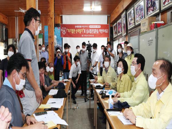 김영록 전라남도지사는 18일 구례5일시장 침수피해 현장을 방문한 박영선 중소벤처기업부 장관을 만나 ‘재해구호기금 지원조건 개선’과 ‘소상공인 재난지원금 신설’ 등 2건을 건의했다.