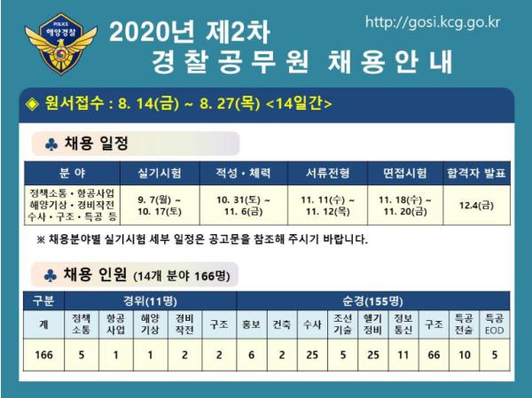 해양경찰청(청장 김홍희)은 현장 전문성 강화를 위해 정책홍보, 해양기상, 수사, 헬기정비, 구조 등 14개 분야 총 166명을 채용한다고 17일 밝혔다.