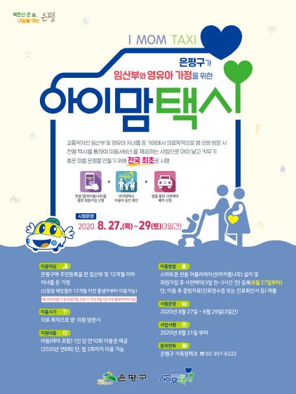 은평구(구청장 김미경)는 아이낳아 키우기 좋은 마을을 만들기 위해 ‘아이맘택시’ 사업을 올해 8월 27일(목)부터 29일(토)까지 3일간 시범운영을 실시하고, 8월 31일 본격적으로 사업을 시행한다고 밝혔다.