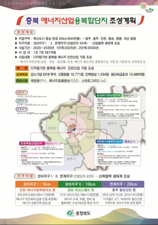 또한, 2030년까지 에너지 강소기업 60개 유치, 전문 인력양성 1,034명, 생산파급효과 13,489억원과 10,771명의 고용창출 효과로 충북 지역경제에 새로운 활력을 불어 넣을 것으로 전망된다.