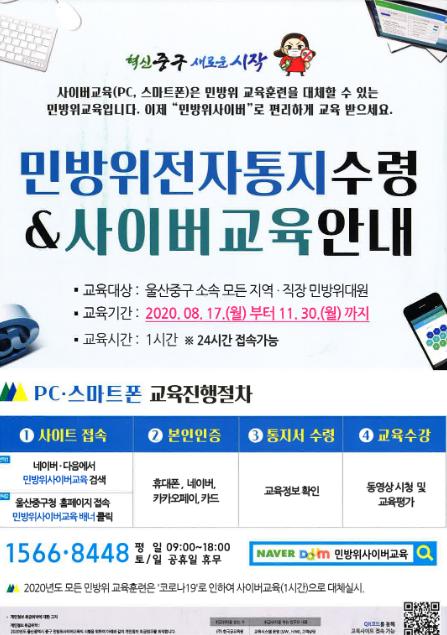울산 중구(구청장 박태완)가 코로나19 감염 확산 방지를 위해 하반기부터 민방위 사이버교육을 확대 실시한다.