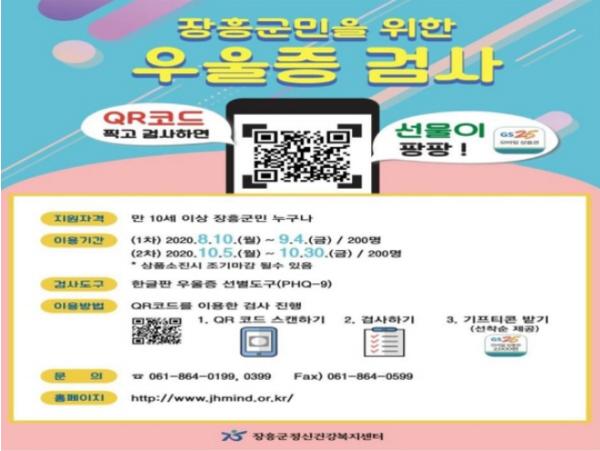 장흥군정신건강복지센터는 자살 고위험군 조기 발견 및 고위험군에 대한 지지 체계 강화를 위해 온라인(QR코드)을 이용한 우울증 선별검사를 실시한다고 밝혔다.