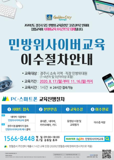 온라인 사이버 교육은 PC와 스마트폰을 이용해 언제 어디서나 편리하게 교육을 받을 수 있으며, 경주시 홈페이지 배너나 인터넷 포털 등을 통해 스마트 민방위교육 홈페이지(www.cdec.kr)에 접속한 뒤 본인인증을 거쳐 교육을 받으면 된다.