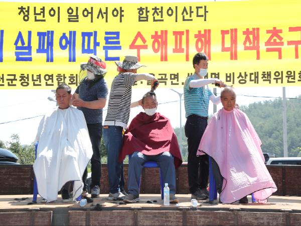 이날 집회는 합천군수(문준희), 합천군 농업경영인 회장 (전삼환), 율곡면 수해피해 보상대책위원장(최해안)의 현장발언을 시작으로 성명서 발표, 구호제창, 수자원공사 물 관리 실패 규탄과 피해보상 촉구를 피력하기 위한 삭발식, 성명서 전달, 풍물공연으로 마무리 되었다.
