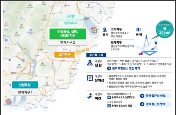 원전해체(원자력) 에너지산업융복합단지는 총면적 20.04㎢로, 코어지구와 연계지구로 나누어 조성된다. ▲‘코어지구’는 기장군의 동남권방사선의과학산단, 반룡부산신소재일반산단, 울주군의 에너지융합산업단지 등을 집중적으로 육성하는 공간으로 마련되며, ▲‘연계지구’는 기계적 원전해체, 에너지 소재/부품/장비 관련 산업 집적지인 녹산국가산단를 핵심으로 하는 미래 에너지산업으로 육성된다.