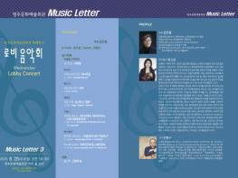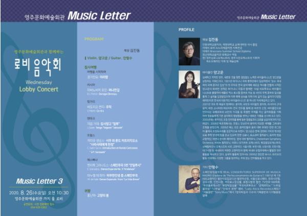 경북 영주시(시장 장욱현)는 오는 8월 26일 오전 10시30분 영주문화예술회관 까치홀 로비에서 소규모(40명 내외) 공연으로 ‘제3회 문화예술회관 Music Letter(로비콘서트)’를 개최한다.