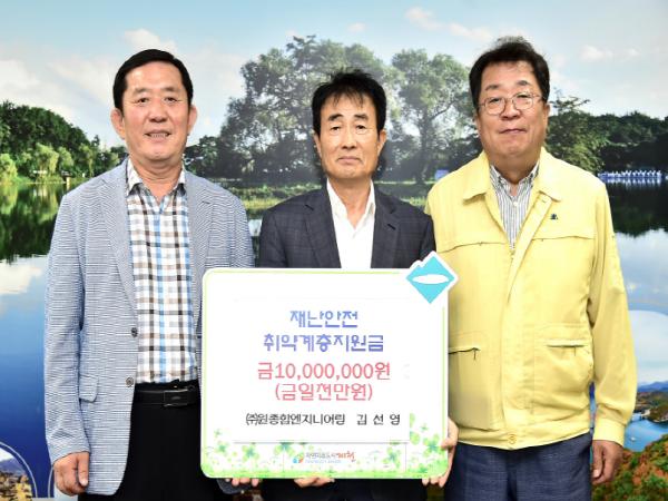 원건설은 지난 14일 제천시청을 찾아 재난안전취약계층지원금으로 일천만원을 기탁했다.