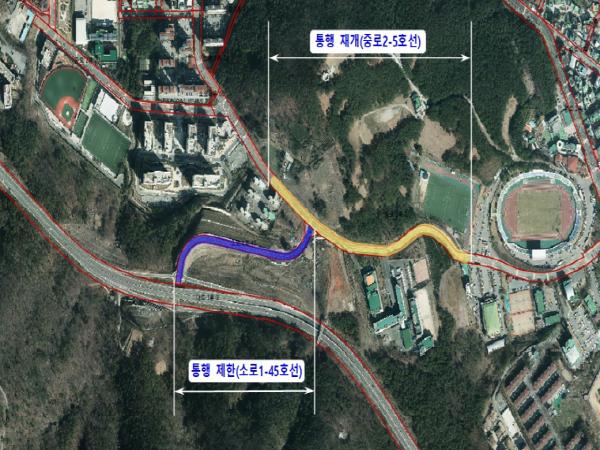 현재 차량의 통행을 제한하고 있는 거제 실내체육관부터 장평 삼성기숙사 구간(중로 2-5호선)에 대하여 시설물의 변위을 측정하고 전문기관의 현장 진단 및 조사 결과에 따른 긴급정비를 완료한바 도로시설물의 계측 결과 변위량이 안정권에 들고 진단 전문기관의 현장 확인결과 차량통행 재개에 문제가 없음을 확인하였다.