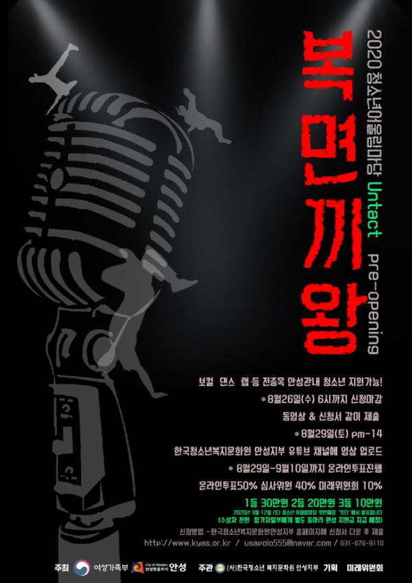 이번 경연 참가대상은 9세에서 19세 미만 청소년이며, 참여를 원하는 청소년은 (사)한국청소년복지문화원 안성지부 홈페이지에 게시된 참가신청서와 댄스·힙합·보컬·연주 등 유튜브(온라인 플랫폼)에서 활용할 수 있는 촬영 영상(5분 이내 제한)을 오는 26일까지 이메일(usapolo555@naver.com)로 제출하면 된다.