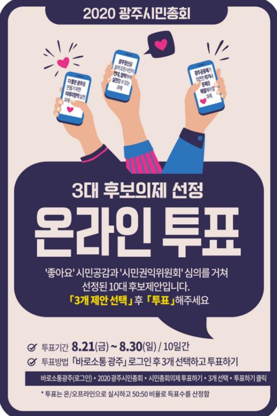 광주광역시는 ‘2020 광주시민총회’에 상정할 3대 후보의제를 정하는 시민투표를 온·오프라인으로 실시한다.