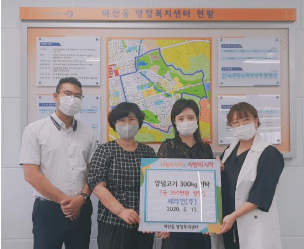 쎄라앤맘(주)가 지난 19일 김포시 마산동 행정복지센터를 찾아 연이은 재난 재해로 지친 지역 주민들을 위해 힐링키트(양념고기 300kg)를 기탁했다.