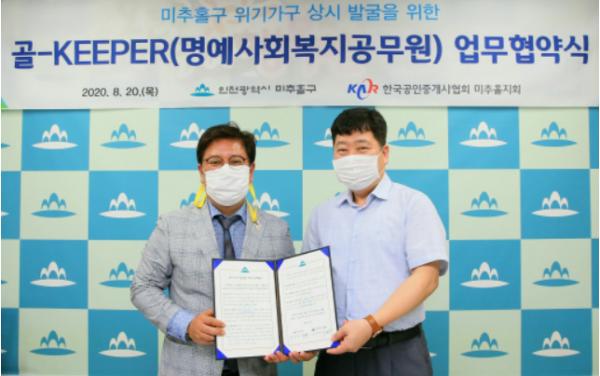이번 협약은 공인중개사협회 미추홀구지회 회원을 명예사회복지공무원 ‘골-KEEPER’로 위촉, 촘촘한 인적안전망을 구축하기 위해 이뤄졌다.