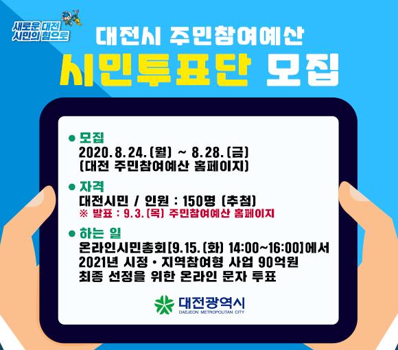 온라인 시민총회에 참여하는 시민투표단 모집은 올해 최초로 진행되며 8월 24일부터 28일까지 대전주민참여예산 홈페이지에서 공개모집한다.