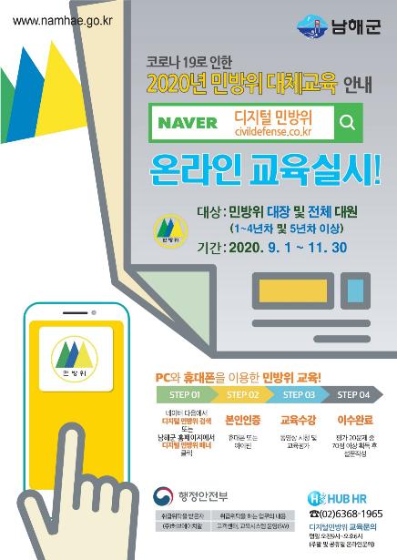 남해군은 코로나19 확산 예방을 위해 올해 민방위 교육을 비대면 사이버 교육으로 대체해 시행한다고 밝혔다.