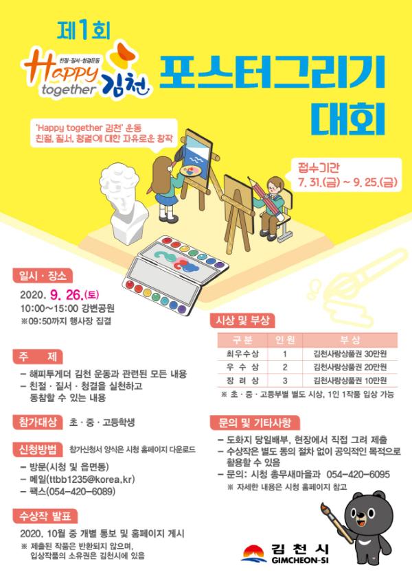 한편 9월 26일로 연기된「Happy together 김천」운동 포스터그리기 대회는 김천시 교동 소재 강변공원에서 오전 10시부터 진행되며, 대회의 공정성을 위하여 행사 당일 도화지를 배부할 예정이다. 신청 방법 및 접수는 김천시청 홈페이지 게시판을 확인하거나 김천시청 총무새마을과(☎054-420-6095)로 문의하면 된다.