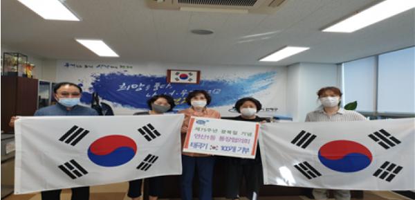 부산시 연제구 연산1동(동장 박순미)은 지난 13일 통장협의회(회장 김경희)로부터 제75주년 광복절을 맞아 전입·출생 세대 등을 위한 태극기 증정 행사 및 게양 홍보를 위한 가정용 태극기 100개(40만 원 상당)를 기증받았다.