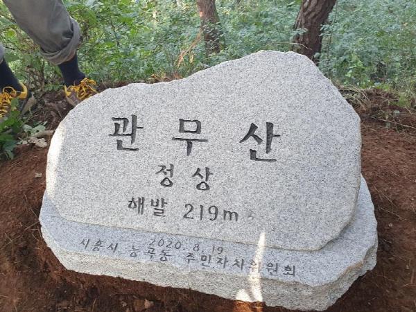시흥시 능곡동 주민자치위원회(서선자 위원장)가 능곡동 유일한 산인 관무산 정상에 지난 8월 19일 표지석을 설치했다.