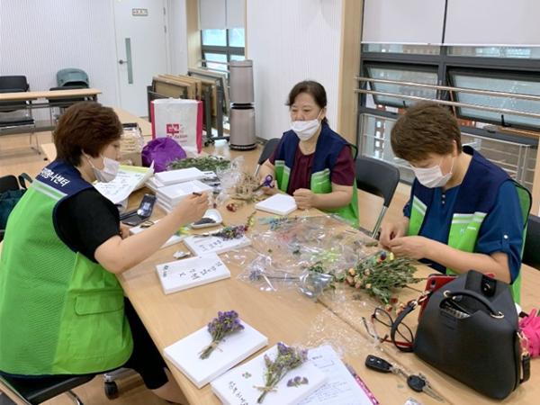 자원봉사캠프는 봉사자들과 함께 정성껏 말린 드라이플라워로 액자를 만들어 동네 미용실, 안경점, 의류판매점, 편의점 등에 선물했다.