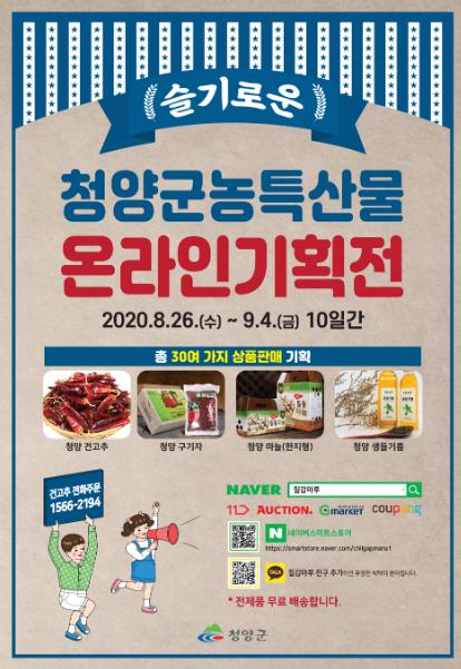 군은 또 오는 26일 대전 유성구 진잠동(학하동) 소재 청양먹거리직매장을 임시로 개장, 오프라인에서도 기획전 상품을 만날 수 있는 기회를 제공한다.