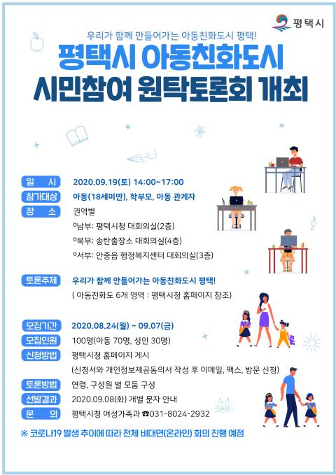 이번 토론회는 약 100명의 아동, 학부모 및 아동 관계자가 참여할 예정이며, 코로나-19 확산방지를 위하여 남부(평택시청), 북부(송탄출장소), 서부(안중읍 행정복지센터)등 3개 지역에서 소규모로 분산 개최되며 각 권역별 의견은 화상회의 시스템을 활용하여 공유함으로써 결과를 도출하는 방식으로 진행된다. 다만 코로나-19 발생추이에 따라 전체 비대면(온라인) 회의 방식으로 전환도 가능하도록 준비 예정이다.