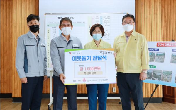 지난 8월 2일 집중호우로 막대한 피해를 입은 안성에 병원, 기업체 등 다양한 곳에서 빠른 수해복구를 위한 성금(성품)을 잇달아 기탁하여, 주변을 훈훈하게 하며 피해를 입은 수재민들에게 큰 위로가 되고 있다.