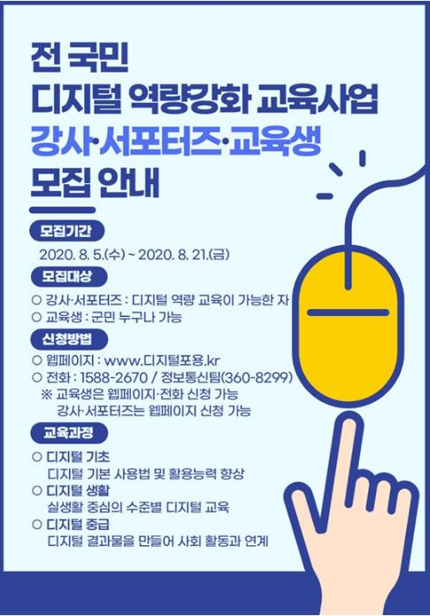 오는 9월부터 곡성군(군수 유근기)에서 과학기술정보통신부 주관 전 국민 디지털 역량 강화 교육이 진행된다.