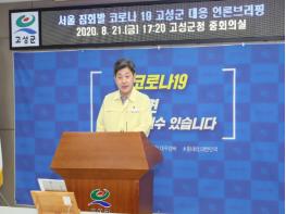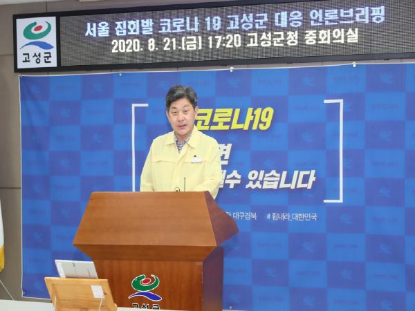 백두현 고성군수는 8월 21일 17시 30분 군청 중회의실에서 ‘서울집회발 코로나 19’고성군 대응 상황을 군민과 실시간 소통이 가능한 고성군밴드 라이브방송으로 진행했다.
