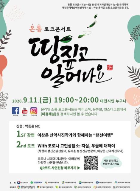 대전시와 대전광역자살에방센터는 2020년 세계자살예방의 날 기념 ‘온통 토크콘서트’를 9월 11일 금요일 오후 7시부터 온라인으로 진행한다고 24일 밝혔다.