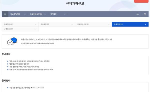 수원시가 불합리한 규제·제도를 신고하고, 주민·기업이 규제개혁위원회 개최를 요구할 수 있는 온라인 창구를 마련했다.