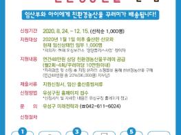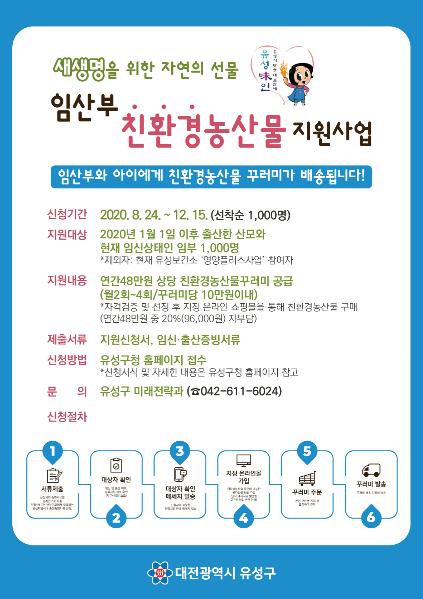 정용래 유성구청장은 “이번 사업은 임산부와 아이들의 건강은 물론 친환경농산물의 안정적인 판로 확보에도 크게 기여할 것으로 기대한다”며, “친환경농산물의 유통과정에 대해서도 철저히 관리하고 점검해 집에서 편안하고 안전하게 받아볼 수 있도록 하겠다”고 말했다.