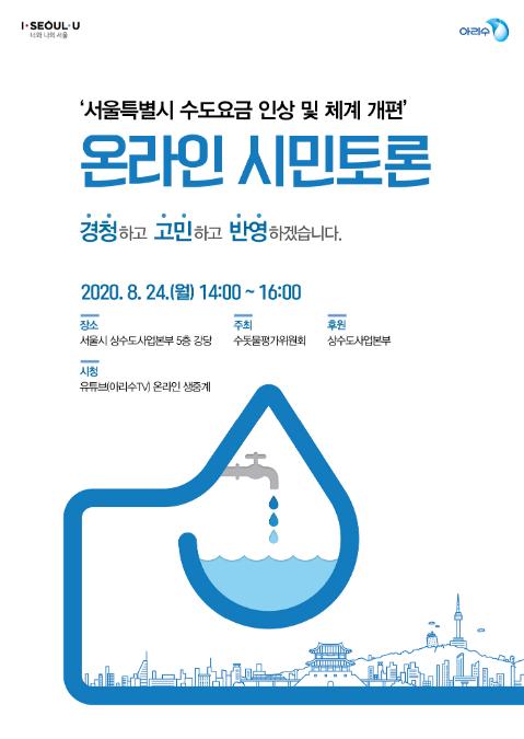 이와 관련해 서울시 상수도사업본부와 수돗물평가위원회는 「서울특별시 수도요금 인상 및 요금체계 개편」에 관한 시민 토론회를 8월 24일 오후 2시 온라인으로 개최하고 다양한 시민 의견을 수렴한다.