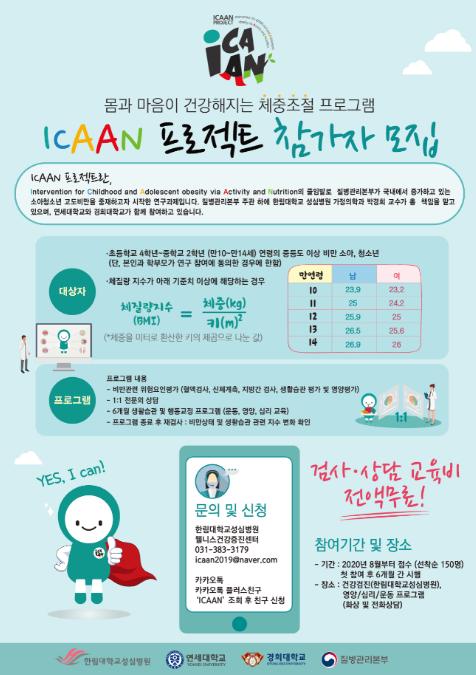 이에 서울시는 대사합병증 위험이 일반 비만자보다 2~3배 높아 관리가 시급한 고도비만 아동·청소년을 대상으로 질병관리본부 연구인 “한림대학교 성심병원 ICAAN 프로젝트”를 연계하여 관리하고자 한다.