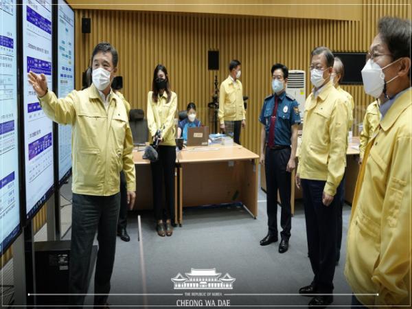 문재인 대통령은 21일 서울시청 재난안전대책본부를 방문해 코로나19 수도권 재확산에 따른 서울시 대책 및 방역현황을 점검했다.