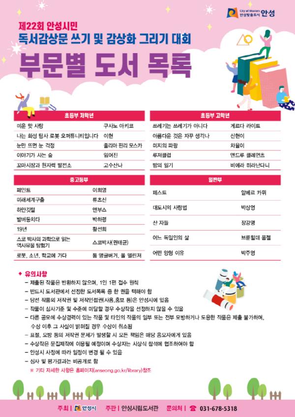 참가자들은 초등부와 중·고등부 그리고 일반부로 나눈 대상 도서를 읽고 독후감을 제출하면 된다. 대상 도서는 안성시 사서가 직접 선정한 ‘페스트’를 비롯한 ‘미운맛 사탕’, ‘미래세계구출’ 등 22권이다.