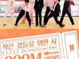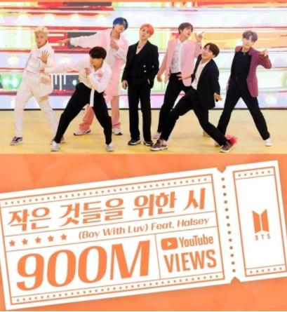 그룹 '방탄소년단(BTS)'의 '작은 것들을 위한 시(Boy With Luv)(Feat. Halsey)' 뮤직비디오가 유튜브 조회 수 9억 뷰를 돌파했다.